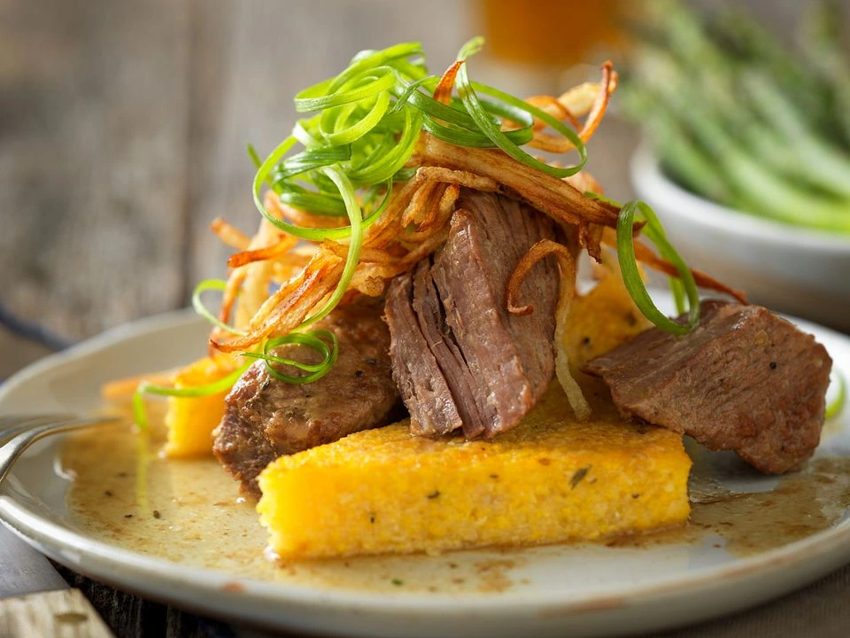 Soft polenta with melted cheese creates a creamy base for the ribs. The mild corn flavor blends nicely with the rich sauce.