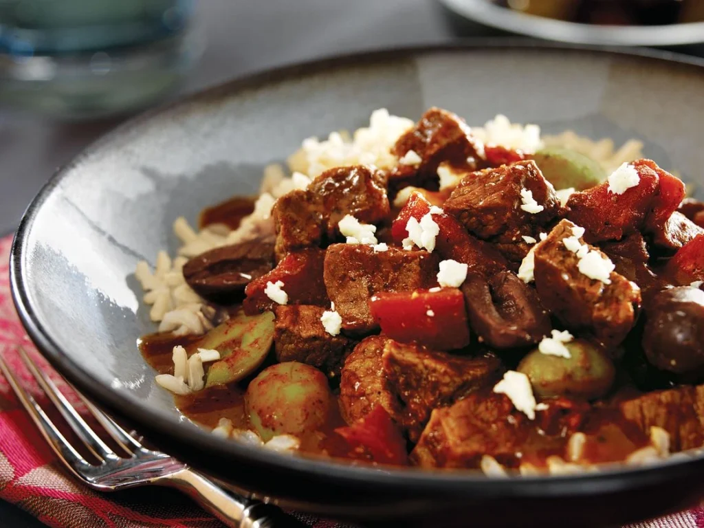 Season the beef with dried oregano and a little lemon zest. After the rice is tender, fold in chopped olives and sprinkle crumbled feta cheese over the top. The salty and tangy flavors balance the richness of the beef.